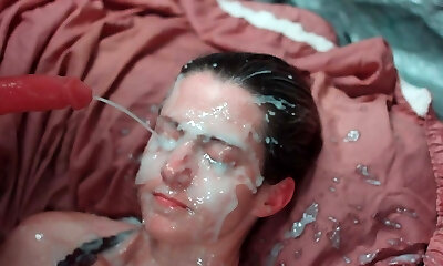 Bukkake! Cum on face and throat of 18 year old big tits teen in lingerie!