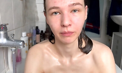 18yo very Skinny Teenie Girl with small tits and large Labia fucks herself till Drizzling