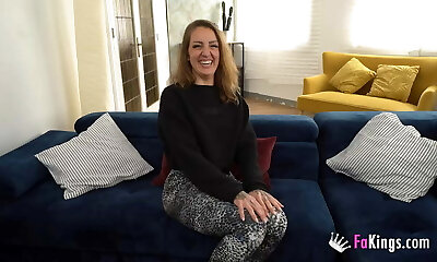 Awesome blonde takes in fountains of jizm via her cooter and mouth on a leather couch